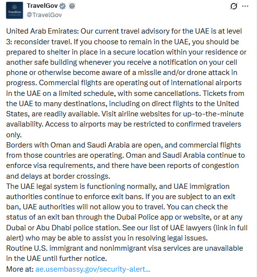 26 березня Державний департамент США оприлюднив рекомендацію громадянам в ОАЕ, що відповідають 3 рівню. Тих, хто запланував поїздку в країну, закликають переглянути це рішення.