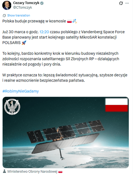 30 березня Польща запустить у космос другий супутник MikroSAR у складі угруповання POLSARIS. Країна має намір стати європейським лідером у цій сфері.