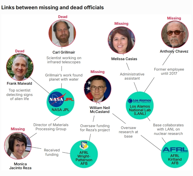 "Перше, що спадає на думку, — це потенційне шпигунство. Наші вчені вже давно є мішенню для ворожих іноземних розвідувальних служб, особливо в галузі ракетних двигунів", — заявив Кріс Свекер, який працював у відділі ФБР, що займається кримінальними розслідуваннями. За останні десять місяців безслідно зникли колишній генерал ВПС, провідний учений NASA і двоє співробітників однієї з найбільших ядерних дослідницьких лабораторій країни. І колишній топ-чиновник ФБР заявив Daily Mail, що це не може бути випадковістю.