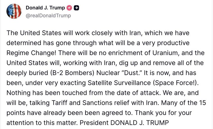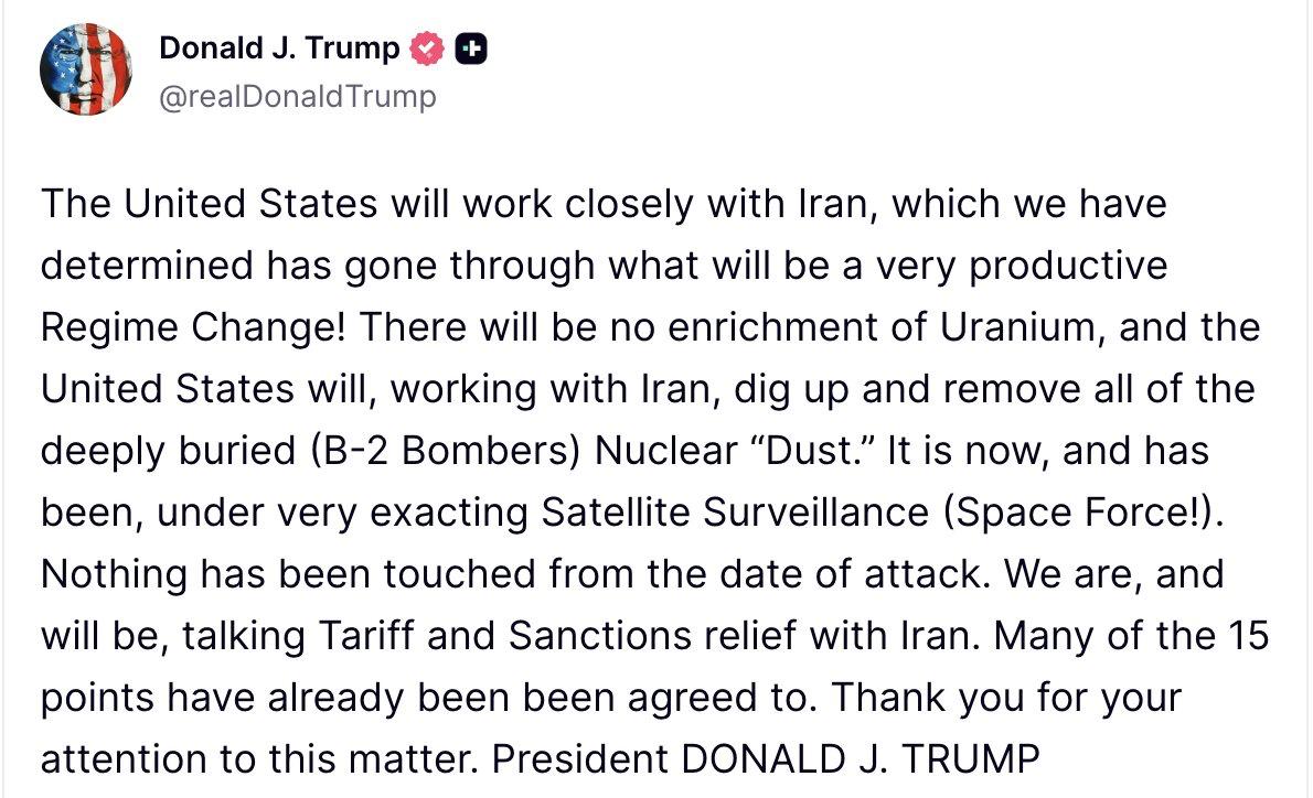 "Сполучені Штати тісно співпрацюватимуть з Іраном, щодо якого ми дійшли висновку, що там відбулися зміни режиму, які будуть дуже продуктивними. Збагачення урану не буде, а США разом з Іраном проведуть роботи з виявлення, розкопування та вилучення всього глибоко захованого ядерного "пилу" (бомбардувальники B-2)", — написав Трамп в дописі у власній соціальній мережі Truth Social.