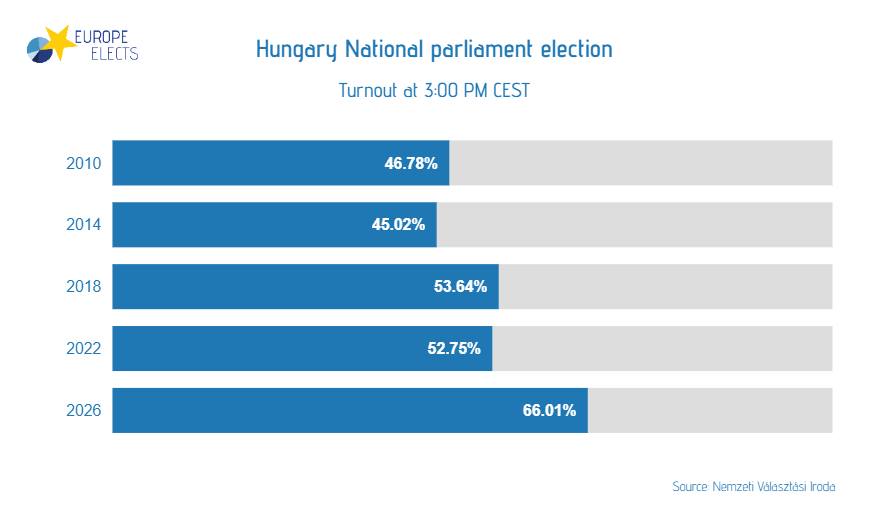 До 15:00 проголосувати прийшло понад 66% виборців. Попередній рекорд угорці поставили 2002 року: тоді явка на парламентських виборах становила 53%, Орбан здобув більшість місць у парламенті, але втратив посаду прем'єра.