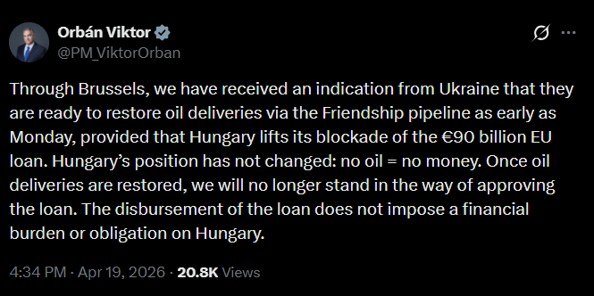 "Через Брюссель ми отримали сигнал від України про те, що вони готові відновити поставки нафти по трубопроводу "Дружба" вже з понеділка", — вказав Орбан.