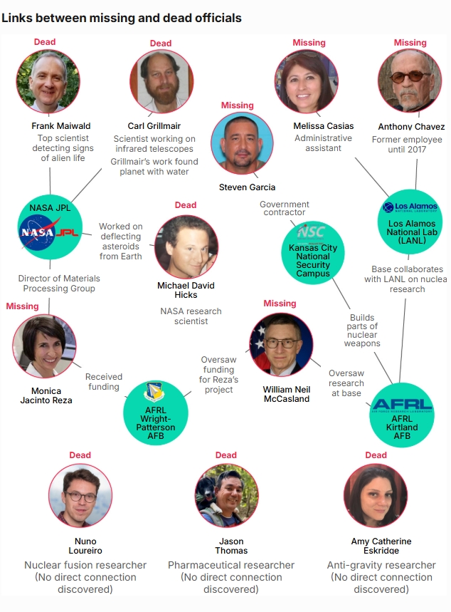 Останніми роками кілька людей, пов'язаних із NASA, ядерними дослідженнями, аерокосмічними програмами та оборонною промисловістю, зникли або загинули за загадкових обставин. Деякі спостерігачі вказують на їхній доступ до секретних проєктів як на причину підвищеної уваги до цих справ.