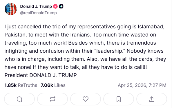 Згодом Дональд Трамп підтвердив скасування візиту своїх посланців до Ісламабаду в дописі у власній соцмережі Truth Social.