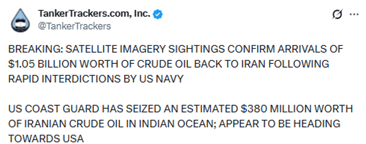Тим часом компанія TankerTrackers, що займається морською розвідкою і відстеженням глобальних поставок нафти, заявила напередодні, що супутникові знімки підтверджують повернення вантажів сирої нафти вартістю близько $1,05 мільярда в іранські порти після оперативного перехоплення з боку ВМС США.