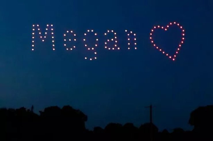 На дисплеї, налаштованому на улюблену пісню пари "6 Words від Wretch 32", дрони сформували в небі кілька зображень на тематику кохання, включно з пляшками шампанського та закоханими серцями, перш ніж промовити слова "Marry me" та "Megan".