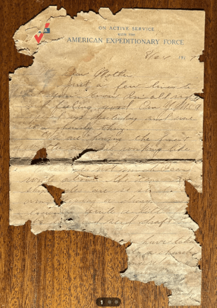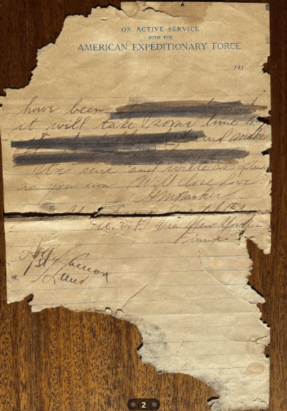 З нечисленних фрагментів листа вдалося прочитати: "Учора відкрився наш Y.M.C.A., і це, звичайно, дуже зручно. У нас прекрасна погода [нерозбірливо] і робота як [нерозбірливо]. Я мало про що можу написати. Корабельні [нерозбірливо] такі суворі. Звичайно, пишіть якомога частіше. З великою любов'ю, G M Parker. A.&.F. Через Нью-Йорк. Франція".