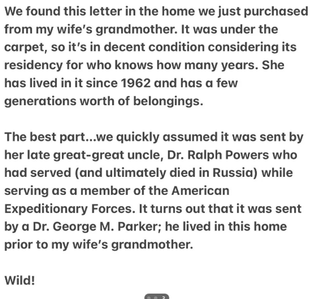 Досліджуючи цю знахідку, чоловік припустив, що лист був відправлений його бабусі прапрадідом, який служив у Франції. Однак пізніше стало відомо, що лист був залишений попереднім власником будинку, доктором Джорджем М. Паркером, який проживав там довгий час.