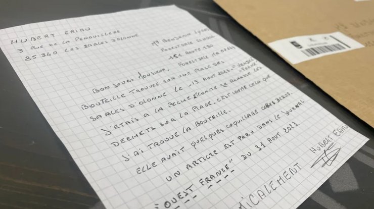 Француз Юбер Еріо, який часто проводить ранок за риболовлею або прибирає сміття на пляжі в Ле-Сабль-д'Олонн, побачив пляшку. Він з'ясував, що всередині була записка.