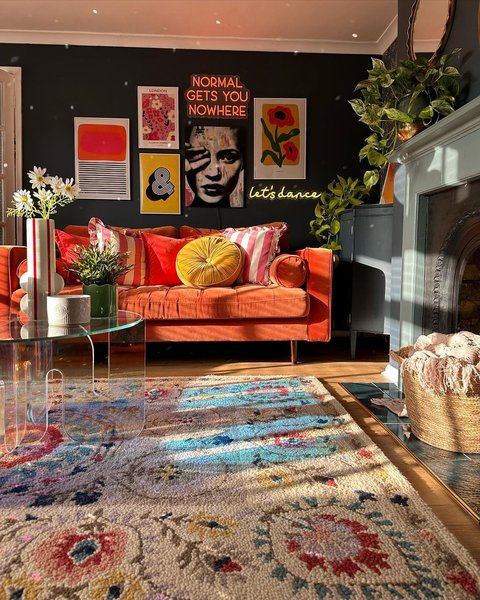 Британка обрала надзвичайно барвисті шпалери з оригінальними узорами, а також використовує багато аксесуарів для декорування кімнат, зокрема рамки для фотографій, картини, постери, м’які подушки, горщики для квітів, дзеркала, килими та красивий посуд.