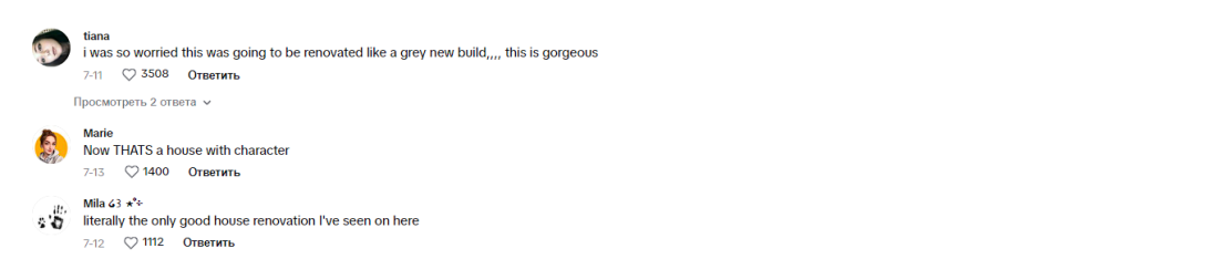 "Слава богу, це не один із тих випадків, коли все стає білим і позбавленим смаку", "Оце будинок із характером", "Молодці, це має теплий, привабливий і милий вигляд", "Буквально єдиний гарний ремонт будинку, який я тут бачив", "Спасибі, що зробили будинок мрії з індивідуальністю, шармом і кольором, а не бездушну білу коробку. Це приголомшливо", — писали вони.