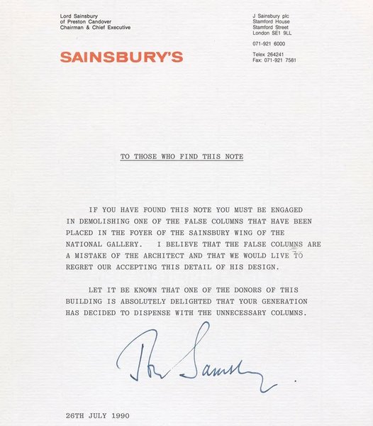 Колишній керівник Sainsbury's, як з'ясувалося, критикував архітектуру крила Національної галереї всього за рік до його відкриття королевою Єлизаветою II 1991 року. Він сховав лист у будівлі, поклавши його в пластиковий конверт усередині того, що він назвав "непотрібними" колонами, в якому висловив надію, що майбутні покоління знесуть їх.