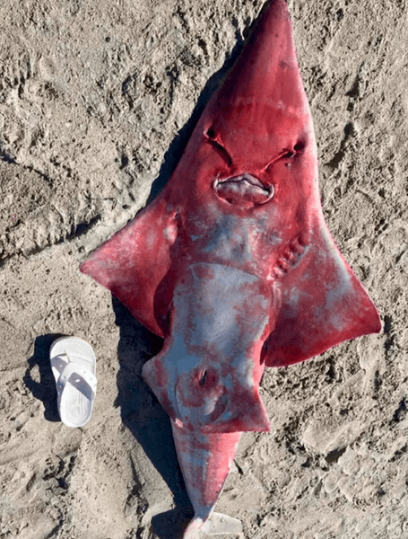 Тварина мала вигляд напівакули-напівската, повністю забарвлена в червоний колір. В істоти були плавці та тіло акули, але плеската голова і рот ската. Риба була червоного кольору і багато хто подумав, що це кров. Тварина виявилася мертвою вже кілька годин — вона загинула або в океані, або на березі.
