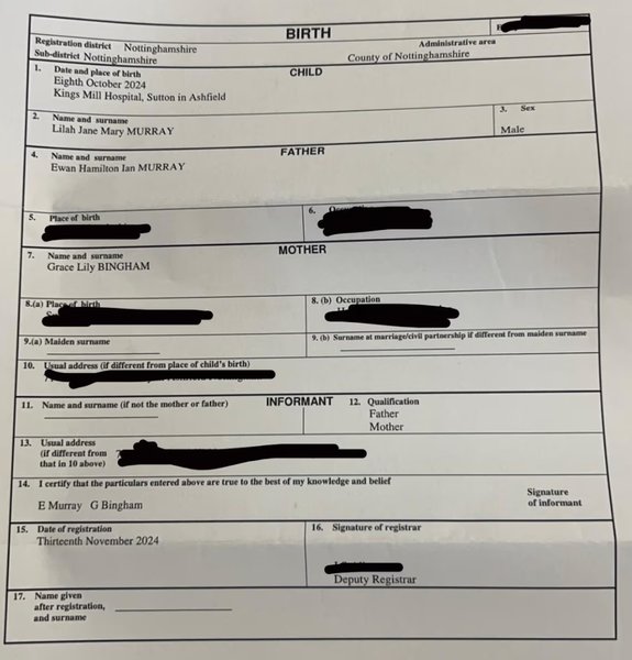 Грейс Бінгем та її партнер Еван Мюррей були раді зареєструвати свою першу дитину в реєстраційному бюро Менсфілда в Ноттінгемширі минулого тижня. Але вони не помітили, що реєстратор написав неправильну стать у свідоцтві про народження, доки його не було надіслано.