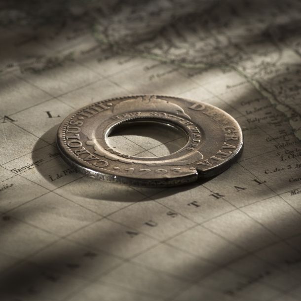 Монета була виготовлена ​​в 1813 році з іспанського срібного долара 1777 року, який був викарбуваний в Мексиці за правління короля Карла III.