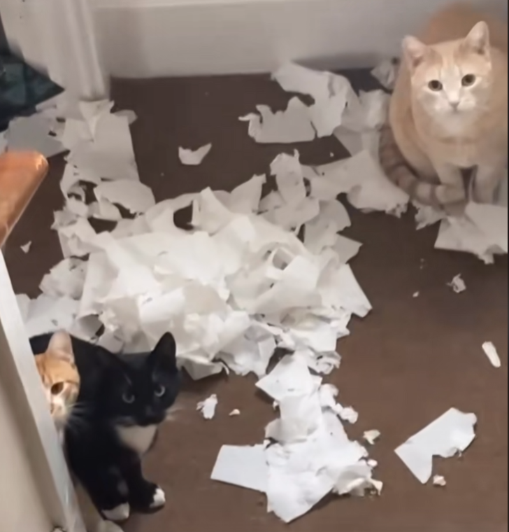 Жінка поділилася відео, яке стало вірусним, набравши понад 751 тисячу переглядів. На кадрах видно, як три її кішки сидять біля сходів, оточені клаптями розірваного туалетного паперу. Їхнє обурення пояснюється просто: господиня не поповнила миску з їжею перед сном.