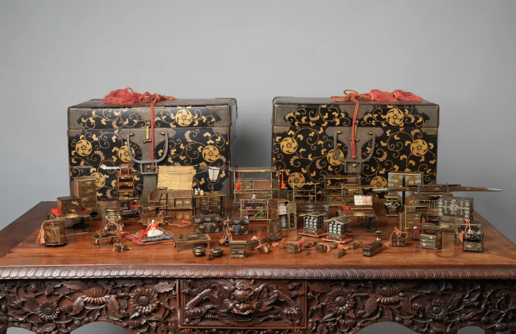 До комплекту входять різноманітні предмети меблів, включно зі скринями, полицями й шафками, а також мініатюрні книжки з каліграфічними написами, паперові ліхтарики, письмові столи, туалетний набір і навіть паланкін з бамбуковими жалюзями. За оцінками фахівців, цей набір датується XIX століттям, що робить його особливо цінним.
