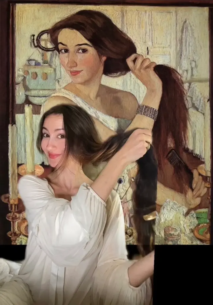Її здивування посилилося, коли чоловік помітив, що у дівчини є точно така ж нічна сорочка, як на автопортреті Серебрякової. Надихнувшись цим, Ладнер вирішила відтворити образ художниці й сфотографувалася в аналогічній позі.