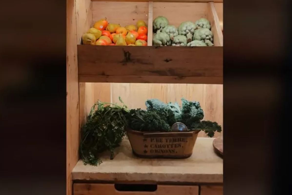 У кадрі можна побачити величезний простір, в якому є кілька дерев'яних кошиків і полиць з різноманітними фруктами та овочами, а також шухляди, де зберігаються різні сири та інші продукти.