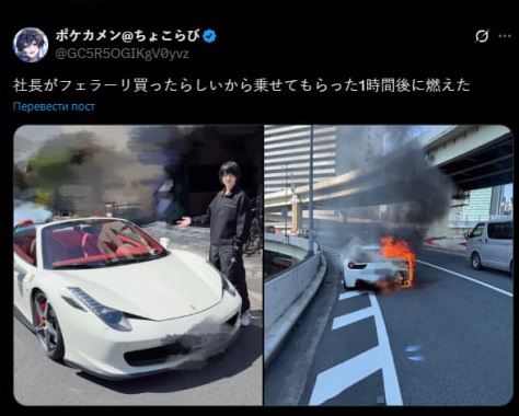 У Японії 33-річний продюсер гурту Chocorabi ненароком спалив щойно придбаний автомобіль Ferrari 458 Spider, на який збирав гроші впродовж 10 років.
