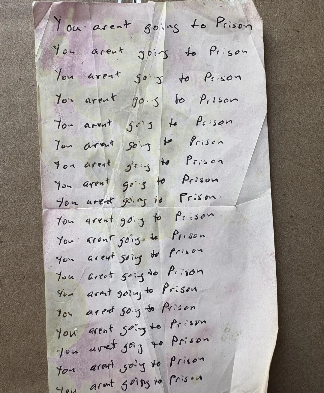 27-річний Кріс, власник ресторану Jade Hibachi в Чарльстоні, перевіряв банку після зміни й натрапив на несподіваний сюрприз. Ним виявився аркуш паперу з однією і тією ж фразою, повтореною 19 разів: "Ти не потрапиш до в'язниці".