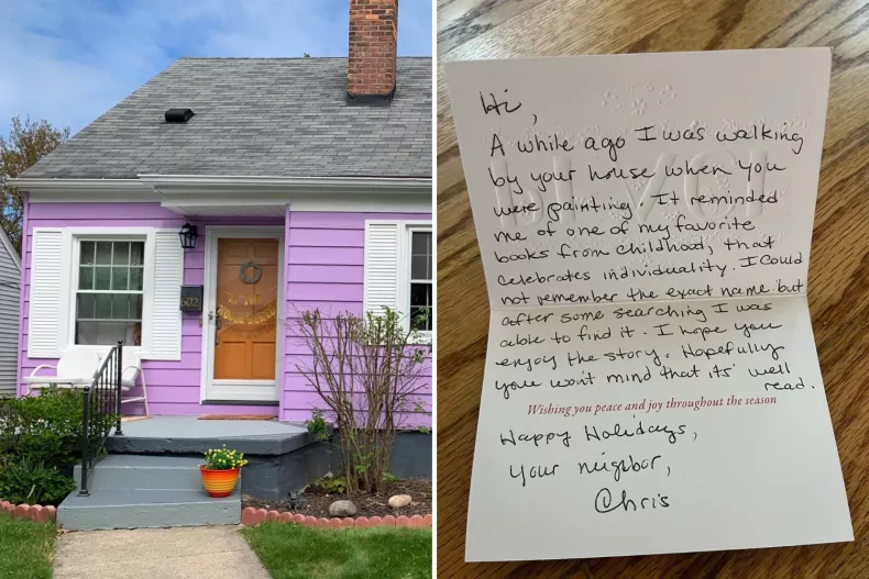 Але найзворушливішим моментом став несподіваний подарунок, який пара знайшла в поштовій скриньці: пошарпана дитяча книжка "Фіолетовий дім містера Пайна" і записка від невідомого сусіда на ім'я Кріс.