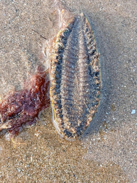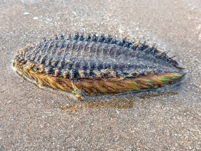 Чоловік розповідає, що вигулював свого собаку на пляжі коли помітив дивну істоту на піску. Здивований тим, що це могло бути, він сфотографував створіння — морську істоту завдовжки близько 15 см, з яскраво-зеленою бахромою та шипами.