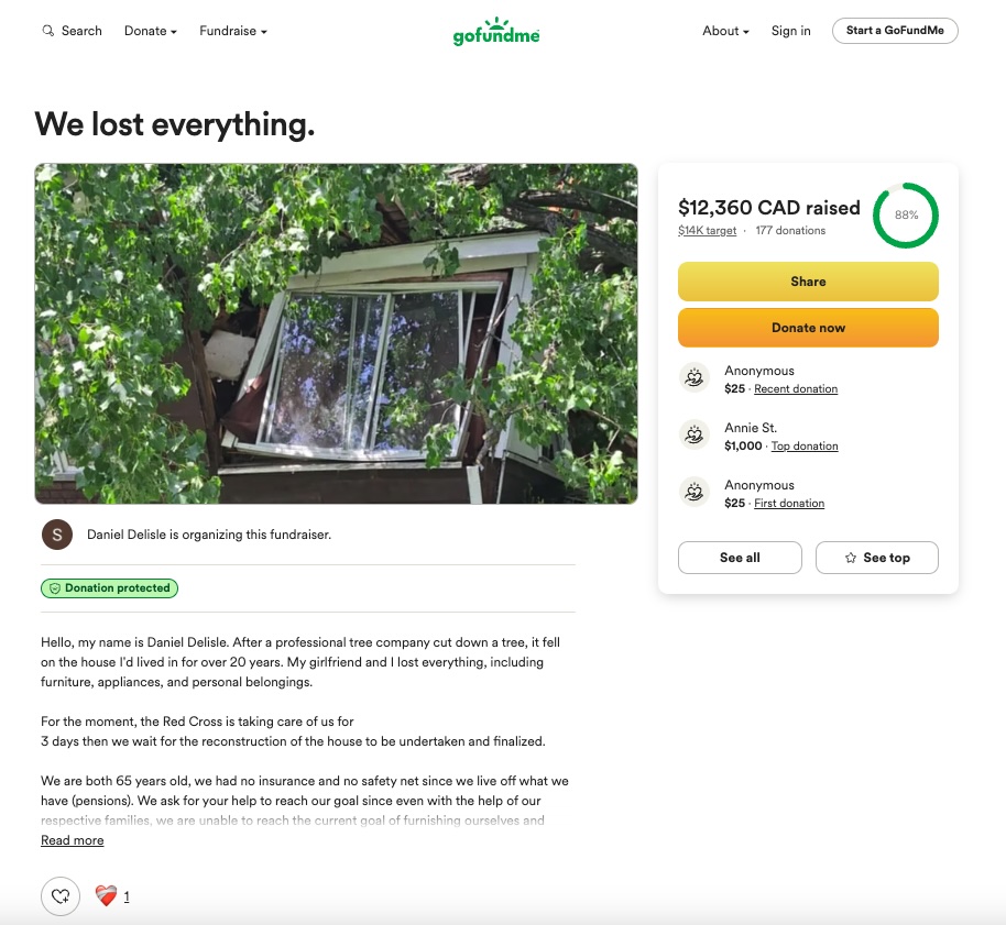 У канадському місті Пуент-Калюм, провінція Квебек, трагедія спіткала Деніела Деліля. Під час невдалого обрізання величезне дерево звалилося прямо на його будинок, зруйнувавши оселю, в якій він прожив понад 20 років. Жахливий момент був знятий на відео і швидко розлетівся мережею.