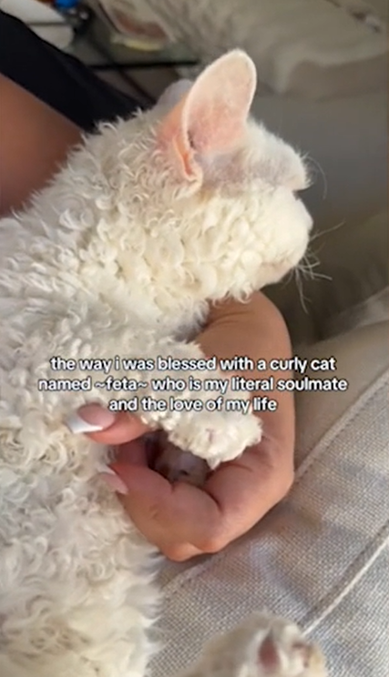 На кадрах, якими власниця поділилася із користувачами соцмереж, Фета притискається до її руки. При цьому кішка демонструє свою кучеряву білу шерсть, яка зацікавила людей.