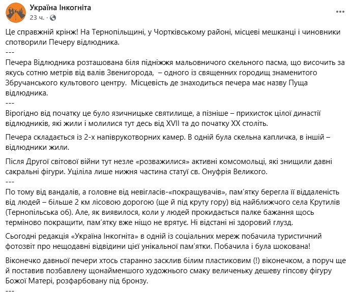 "Це справжній кринж! На Тернопільщині, у Чортківському районі, місцеві мешканці та чиновники зіпсували Печеру відлюдника", ідеться в повідомленні ГО у Facebook.