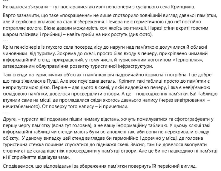 "Кріпити такі таблиці прямо до пам'ятника неприпустимо. По-перше, для цього в скелі, де видовбана печера і яка є невід'ємною частиною пам'ятника, довелося просвердлити отвори. А це — пошкодження пам'ятника. Ба більше! Таблицю вставили саме на місці, де було видно сліди якогось давнього напису (через вивітрювання — нечитабельного). Ось над тим написом — і прикріпили".