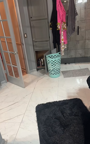 Поки жінка говорить, кадри демонструють плитку у ванній кімнаті, кошик для білизни, шафи та одяг. З першого погляду здається, наче більше нічого у кімнаті немає.