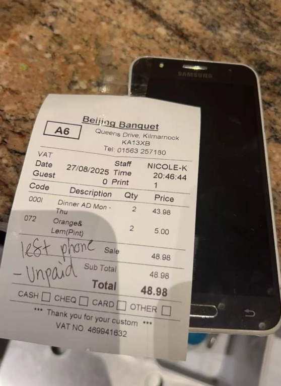 За даними місцевих ЗМІ, у середу, 20 серпня, чоловік і жінка накопичили майже 50 фунтів стерлінгів (2784 гривні) у ресторані Beijing Banquet на Queen Drive. Після того як їхню картку відхилили, пара залишила старий телефон, пообіцявши повернутися з оплатою, однак так і не зробила цього.