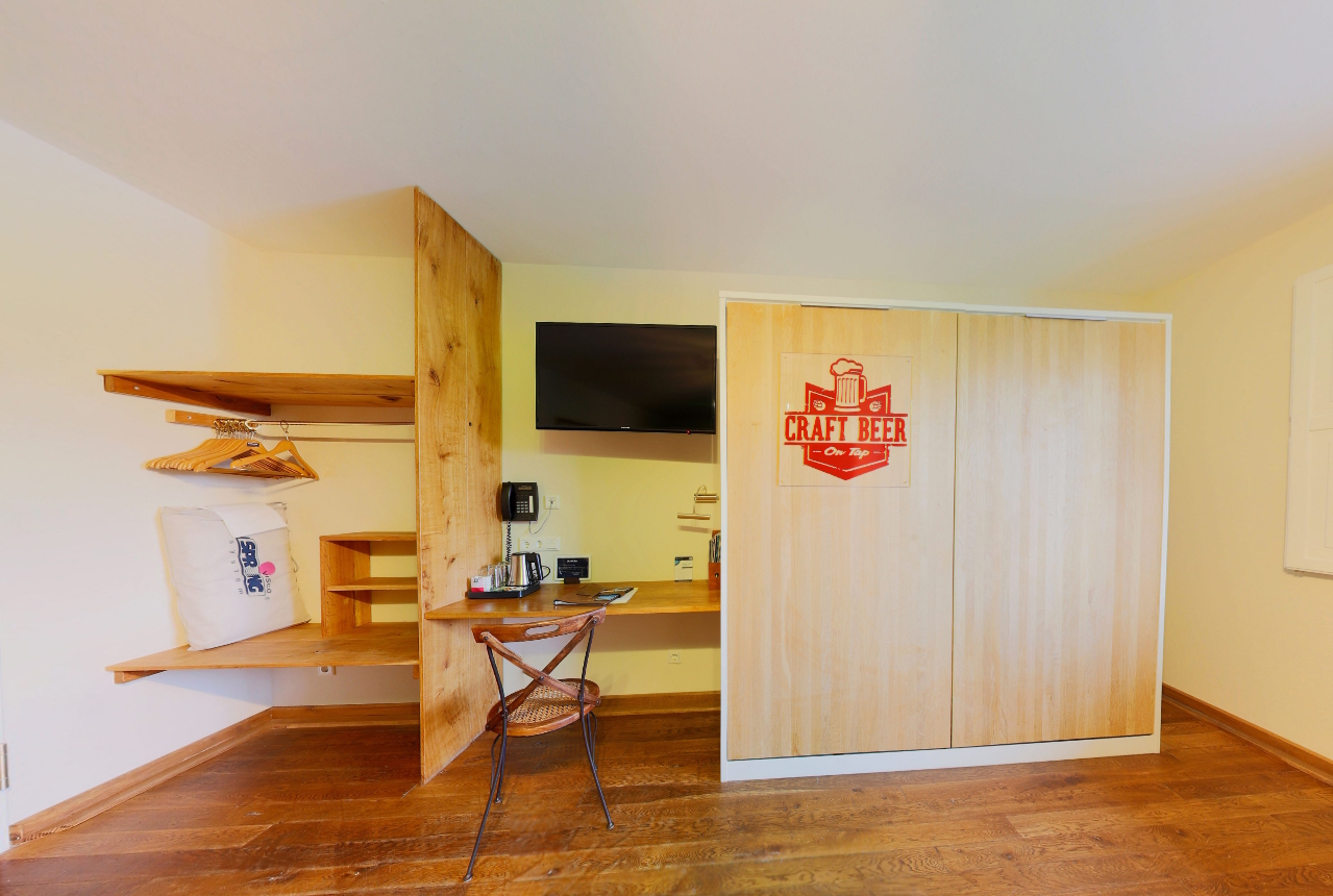 У номері встановлено величезне ліжко з діжки з ковдрами, подушками і простирадлами, а також декор у пивній тематиці, що включає приставний столик з ящиків і відповідний дерев'яний стіл зі стільцем.
