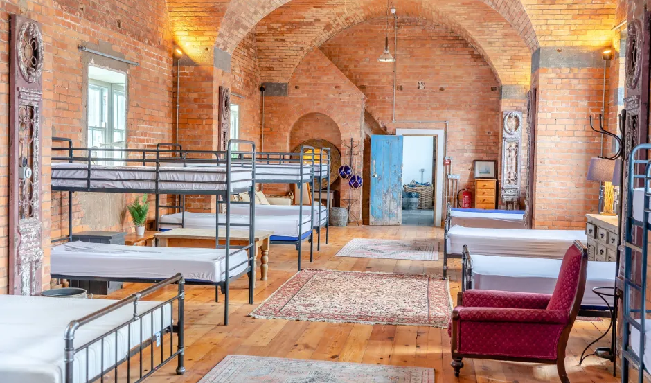 Внутрішній інтер'єр форту XIX століття з ліжками для гостей і цегляними склепіннями