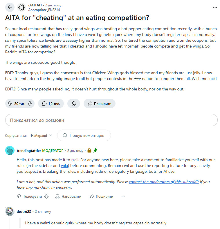 Користувач Reddit із ніком Appropriate_Fix2214 взяв участь у змаганнях у ресторані, відомому своїми гострими крильцями. За його словами, організм майже не реагує на капсаїцин — речовину, яка й створює відчуття пекучості.