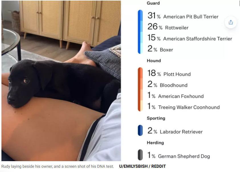 Жінка вирішила провести ДНК-тест, щоб точно дізнатися генетичний склад цуценя. Результати шокували власницю: Руді виявився лише на 2 відсотки лабрадором-ретривером. Основну частину його ДНК становили американський пітбультер’єр (31%), ротвейлер (26%), американський стаффордширський тер’єр (15%) та плотт-хаунд (18%). Невеликі частки мали боксер і німецька вівчарка.
