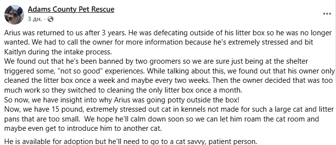 "Під час розмови ми з’ясували, що його господар чистив лоток лише раз на тиждень, а інколи й раз на два. Потім вирішив, що й це забагато роботи, тож перейшов на прибирання лотка раз на місяць", — пишуть представники Adams County Pet Rescue.