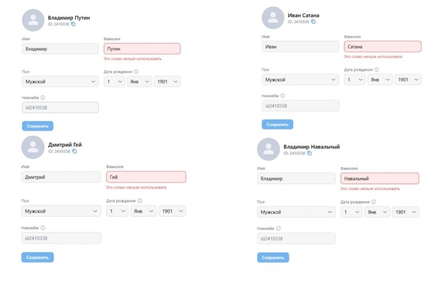 Соціальна мережа "ВКонтакте" заборонила користувачам писати замість свого прізвища або імені слова "Путін", "Сталін", "Трамп", "Навальний", "Сатана" і "Гей". "СВО", як називають у Росії війну в Україні, теж під забороною. Якщо спробувати ввести ці слова в графу "ім'я" або "прізвище" в профілі користувача, соцмережа пише повідомлення про помилку і не дає зберегти результат, повідомляє "Верстка".
