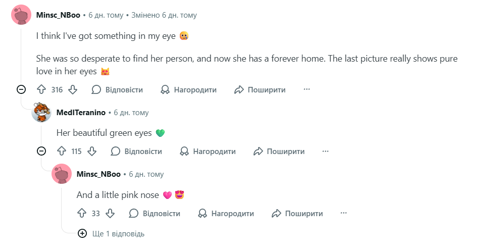 Розчулені добрим фіналом історії коментатори дякують авторці за те, що прихистила тварину. Жінка відповідає, що не могла б спокійно спати, якби не забрала свою пухнасту подругу додому.