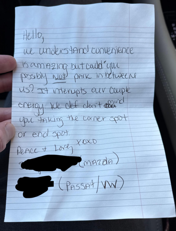"Привіт. Ми розуміємо, що зручність — це прекрасно, але чи могли б ви не паркуватися між нами? Це порушує нашу парну енергію. Ми зовсім не проти, якщо ви займете кутове чи крайове місце. Мир і любов", — йдеться в тексті записки.