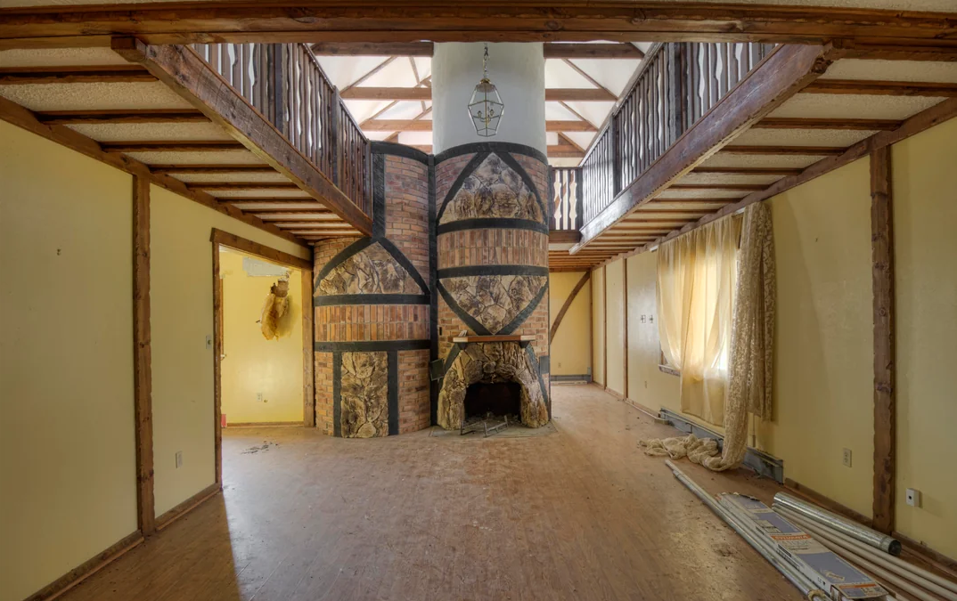 Інтер'єр покинутого особняка в стилі Тюдорів з унікальним цегляним каміном і гвинтовими сходами, що ведуть на балкон