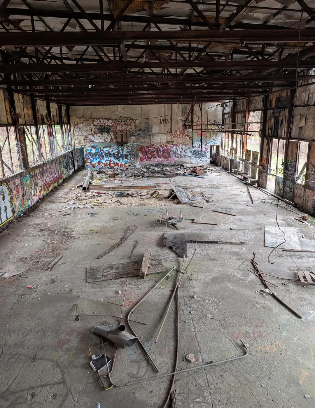 Всередині — іржаві машини, мох і трава, що пробиваються крізь бетонну підлогу, а дах уже давно обвалився, тож усе просто неба.