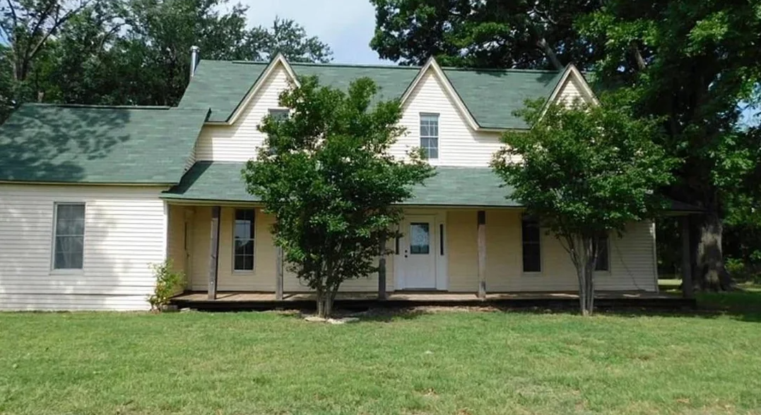 Дерев'яний будинок із зеленим дахом, оточений деревами, який пізніше знищив торнадо