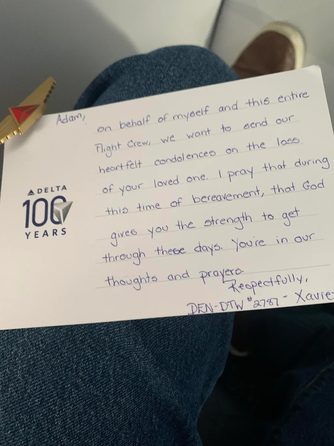 У довшому рукописному листі від бортпровідника було зазначено: "Адаме, від себе та всього екіпажу цього рейсу ми хочемо висловити найщиріші співчуття у зв’язку з втратою твоєї близької людини. Молюся, щоб у цей час жалоби Бог дав тобі сил пережити ці дні. Ми думаємо про тебе й молимося за тебе. З повагою, DEN–DTW #2787 – Ксав’єр".