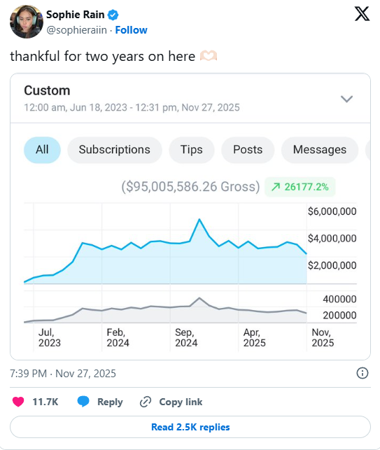 У публікації Софі Рейн показала зображення з підсумковими цифрами. Її загальний дохід за два роки склав 95 005 586 доларів (приблизно 4 млрд гривень), а зростання перевищило 26 000%. У 2025 році її щомісячний заробіток коливався від 3 до 4 мільйонів доларів. До посту вона додала підпис: "Вдячна за два роки тут" і сердечко, складене руками.