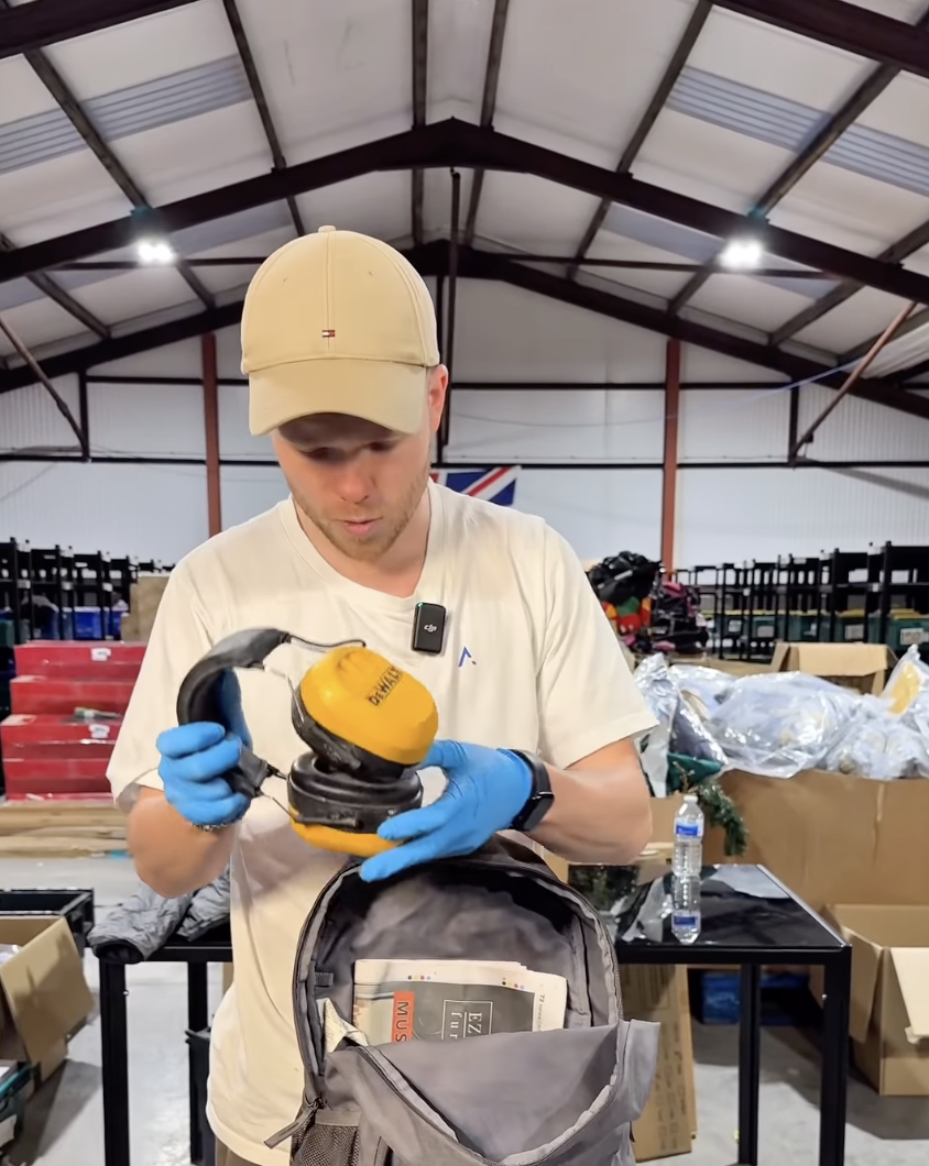 Чоловік у рукавичках оглядає знайдений рюкзак і захисні навушники на складі із втраченим багажем