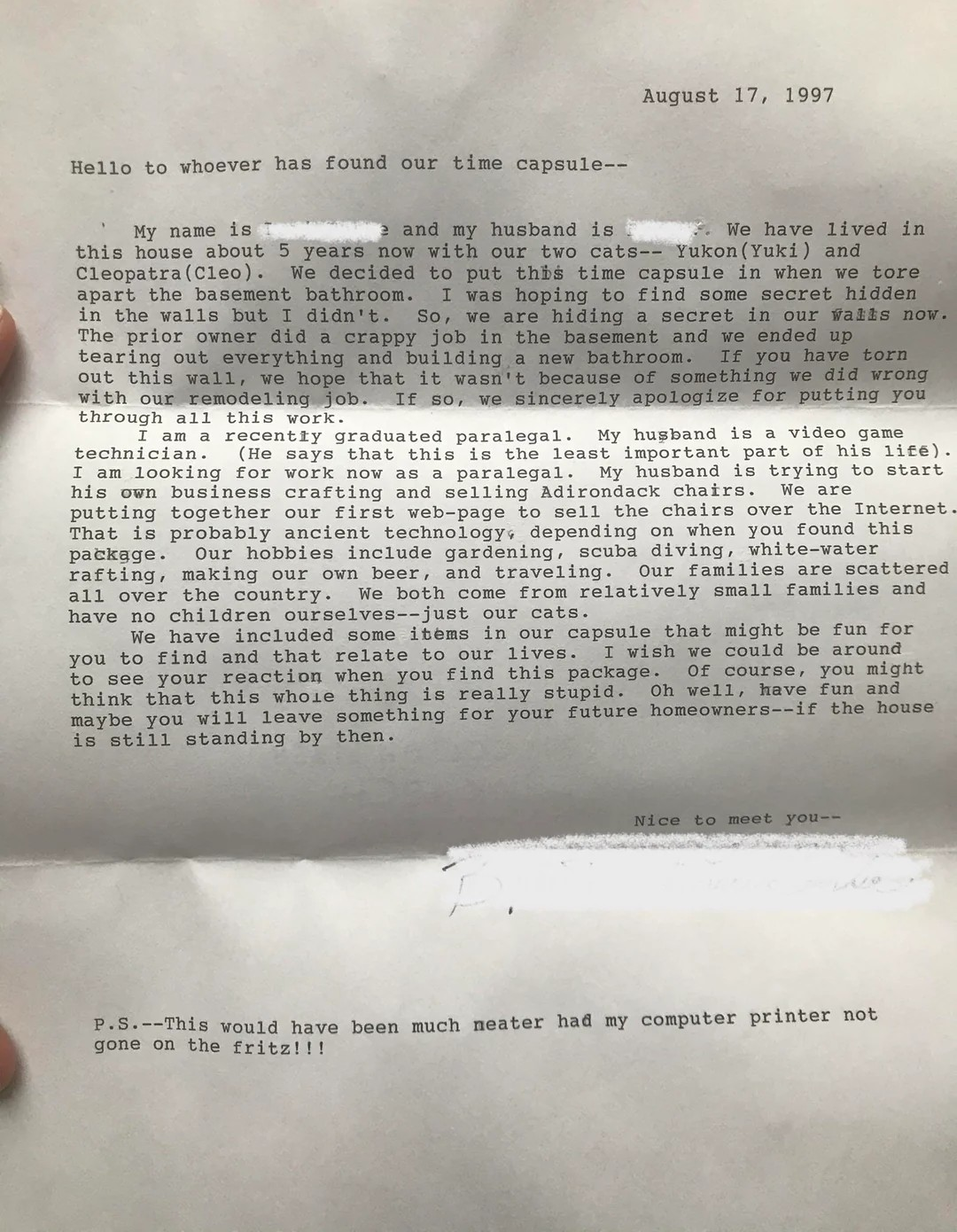 Під час ремонту підвального санвузла подружжя знайшло капсулу часу, яку було заховано в стіні ще в 1997 році. Про це вони розповіли в дописі в Reddit.
