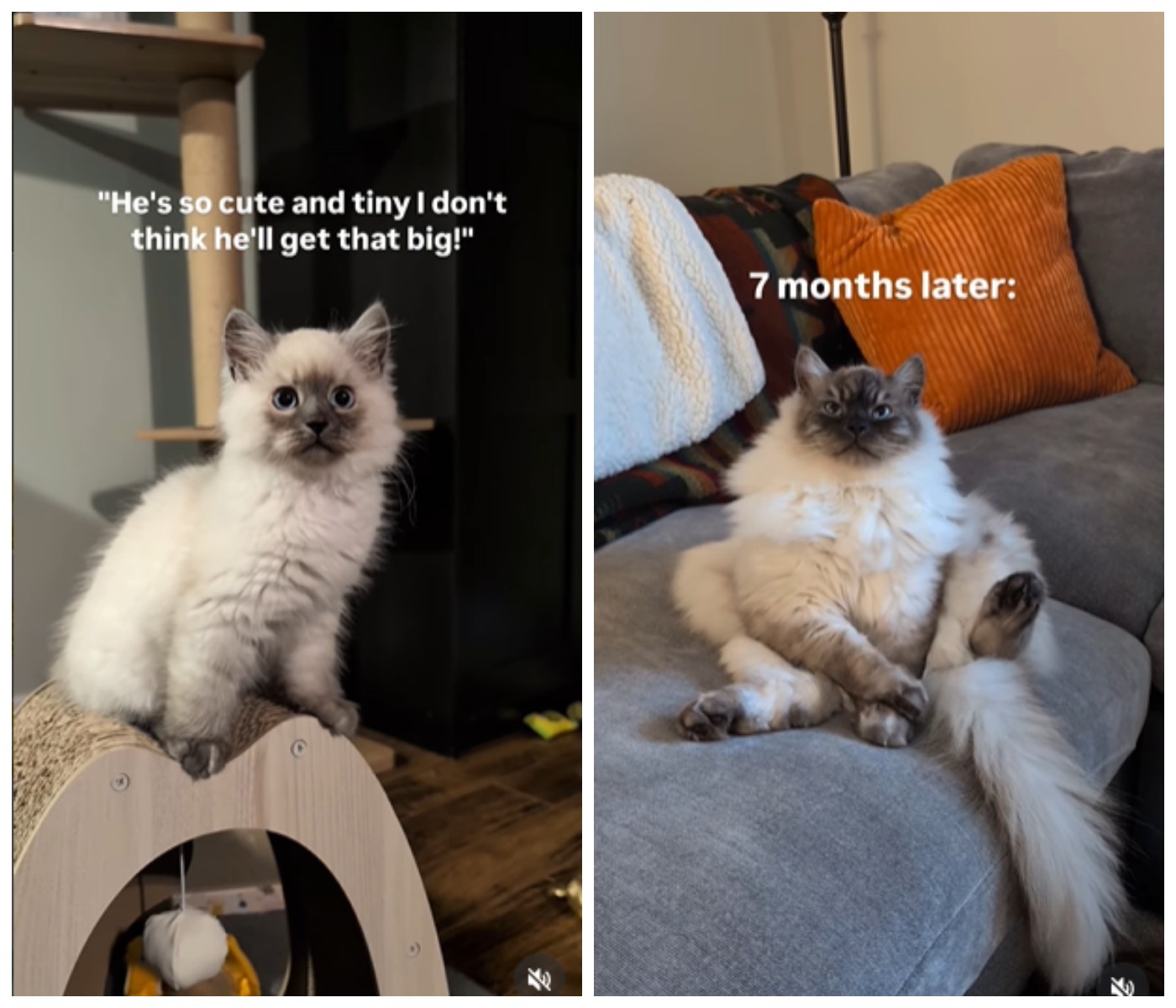 Жінка показала на першому кадрі маленьке кошеня на ім'я Спроут, що більше нагадує невеликий клубок шерсті з великими очима. На іншому кадрі — той самий кіт, однак вже у віці 7 місяців, що досяг уже великих розмірів.