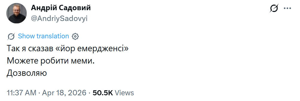 "Так я сказав "йор емердженсі". Можете робити меми. Дозволяю", — написав Садовий у мережі X.